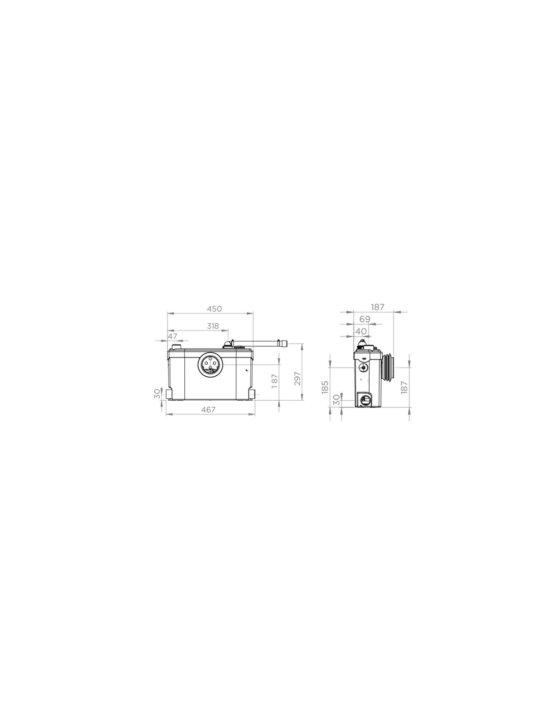 Tem 4 entradas para ligar os diferentes elementos e consegue evacuar águas residuais até 2,5 m na vertical ou 40 m na horizontal com uma instalação fácil que necessita apenas de água, um pequeno dreno e eletricidade.